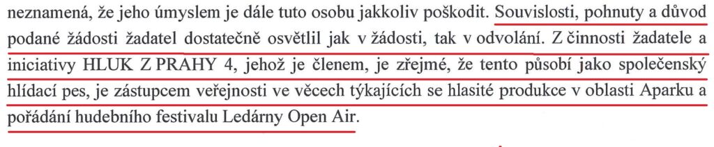 Magistrát hlavního města Prahy nám dal opět za pravdu ve věci našeho odvolání proti neposkytnutí informací úřadem Prahy 4. Důležitější je ale obsah tohoto rozhodnutí č.j. MHMP 640657/2023 ze dne 31.3.2023. V tomto rozhodnutí totiž Magistrát hlavního města argumentoval tím, že iniciativa občanů HLUK Z PRAHY 4 plní funkci „společenského hlídacího psa“ Úřadu městské části Praha 4 ve věci bezohledných a obtěžujících hudebních produkcí v Ledárnách Braník a Aparku.