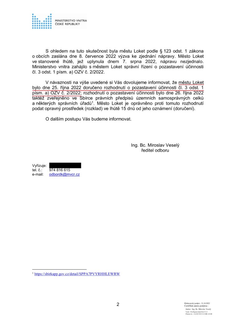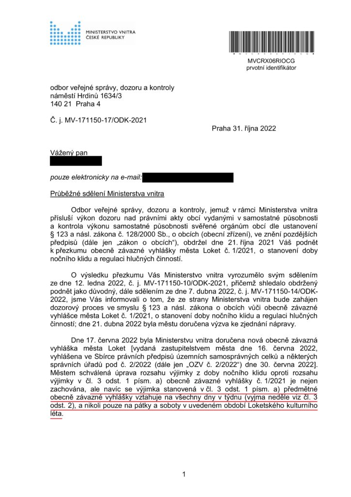 Vyhláška, podepsaná starostou Petrem Adamcem z České pirátské strany https://wiki.pirati.cz/lide/ing._mgr._petr_adamec , upravovala noční klid takto: „Na území města Loket se počátek doby nočního klidu posouvá z 22:00 hodin na 23:00 hodin v době konání akcí: Loketského kulturního léta v období od 1. 5. do 30. 9. každého roku, Ples města Loket, Pálení čarodějnic, Vinobraní, Muzikantská noc.“ K vyhlášce Ministerstvo vnitra uvedlo: „zkrácení doby nočního klidu každý víkend po dobu několika měsíců nebude již možné z povahy věci považovat za výjimečné případy. Stanovení výjimky v čl. 3 odst. 1 písm. a) má tak de facto povahu „obecné výjimky“ z doby nočního klidu, což je nutné hodnotit jako rozporné s ustanovením § 5 odst. 7 zákona o některých přestupcích, a s čl. 104 odst. 1 Ústavy, a to v návaznosti na požadavky Ústavního soudu uvedené v nálezu sp. zn. Pl. ÚS 4/16.“. Proto Ministerstvo vnitra účinnost protiprávní vyhlášky pozastavena. Rozhodnutí o pozastavení vyhlášky města Loket naleznete zde: https://sbirkapp.gov.cz/detail/SPPA7PVYRHHLEWRW