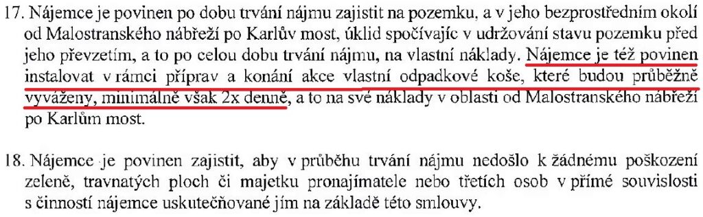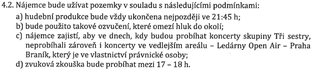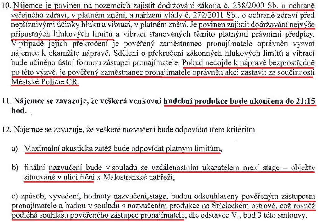A teď se podívejme na srovnání, jak to funguje tam, kde nekašlou na svoje občany a nejdou z nějakého důvodu na ruku bezohledným hudebním šíbrům. Z nájemní smlouvy MČ Praha 1 s pořadatelem festivalu můžeme vidět, že když se skutečně chce, tak to jde.