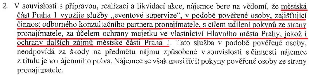 Praha 1 si na rozdíl od neschopného bakaláře Hrozy (TOP 09) dokáže se zajištěním pořádku v nájemní smlouvě poradit. Z nájemní smlouvy MČ Prahy 1 vyplývá je zajištěn nepřetržitý dozor MČ nad akcí která se na jejím pozemku odehrává. Pořadatel tak zcela podléhá pokynům a stížnost na hluk lze okamžitě, efektivně řešit.