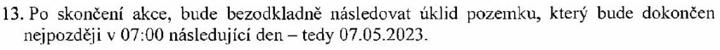 Pozemek musel být uklizený již druhý den v 7:00 hod ráno. Pořadatel musel zajistit odvoz odpadků. Nepřichází tedy v úvahu situace jako na Praze 4 kde se v širokém okolí válelo množství opilců. Všude odpadky a pach moči.