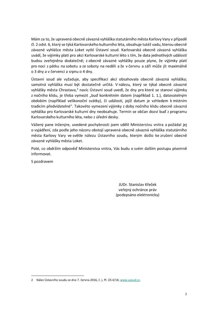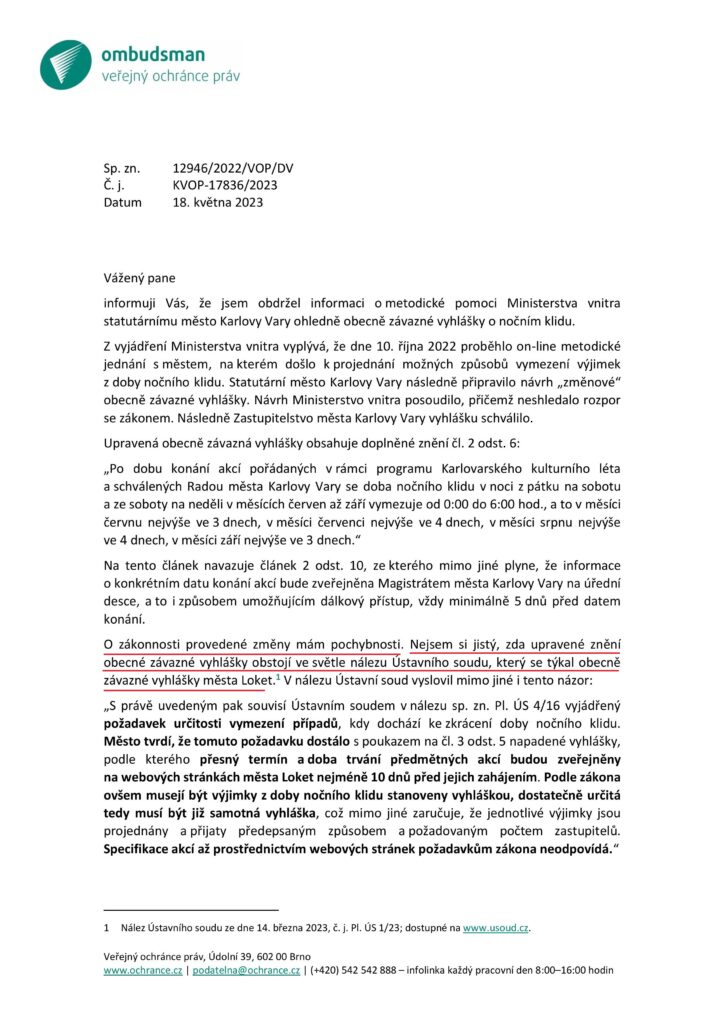 Pokud jde o Karlovy Vary, tak tam je připuštěno dělat hluk z hudebních produkcí v době nočního klidu celkem 14 dnů přes léto. To přišlo Ministerstvu vnitra jako v pořádku. Nikoliv ale zde žijícímu občanskému aktivistovi, který se obrátil na Veřejného ochránce práv. Veřejný ochránce práv mu dal za pravdu a již argumentoval právě Nálezem Ústavního soudu, který se týká zrušené části vyhlášky města Loket. Přečtěte si závěry Veřejného ochránce práv.