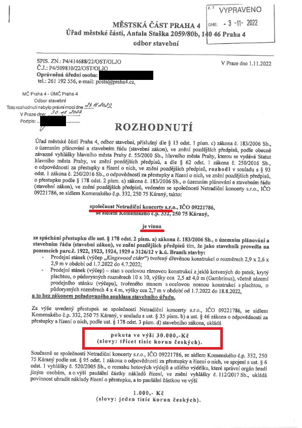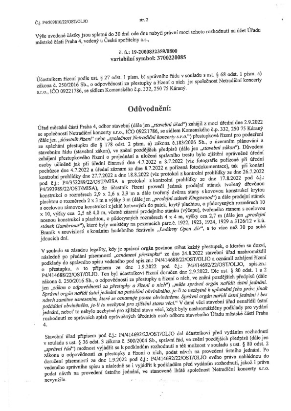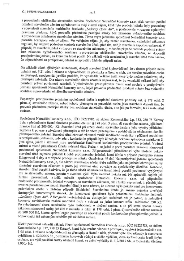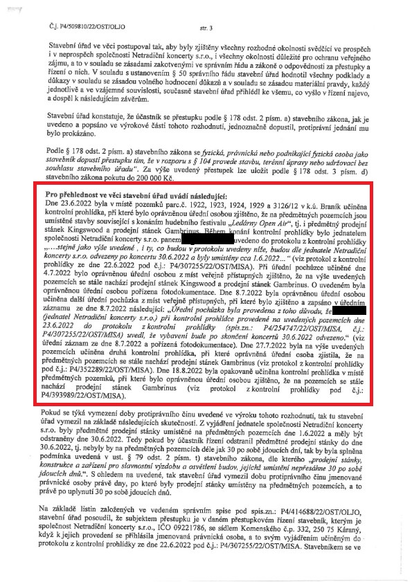 Už třetí pokuta padla „ohleduplnému“ pořadateli festivalu v Ledárnách Braník od stavebního úřadu. Jde o provedení dalších staveb bez příslušných povolení v roce 2022 pořadatelem Netradiční koncerty, s.r.o. LEDÁRNY OPEN AIR. Pokuta 40.000,-Kč je sice malá, nicméně v případě opakovaní se bude nepochybně navyšovat.