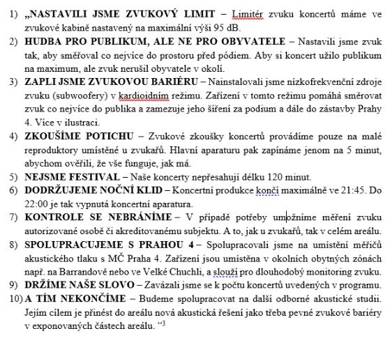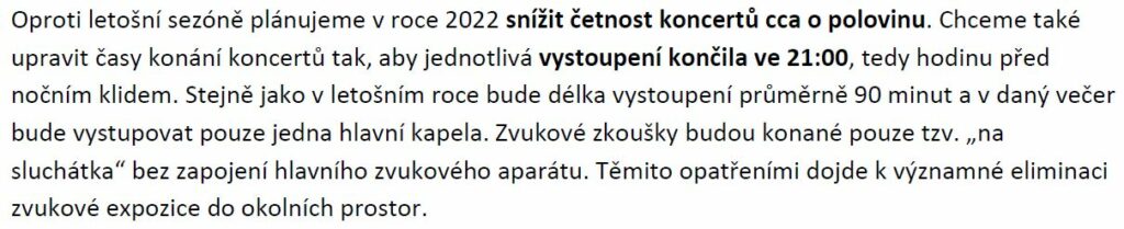 Ani to ale pořadatel nedodržel. V roce 2021 bylo koncertů 54, polovina je 27. Koncertů ale bylo více. Ani 120 minut produkce nebylo vždy dodrženo. O průběhu zvukových zkoušek v roce 2022 se můžete přesvědčit z videa v tomto článku: https://www.ceskobezhluku.cz/radni-mhmp-a-p4-michal-hroza-slibem-nezarmoutis Pokud jde o nesmyslné sliby pořadatelů o zázračných opatřeních k zamezení šíře ní hluku z areálu v roce 2022, tak to nakonec dopadlo jako vždy. Na hluk z areálu přišlo na Magistrát hlavního města přes 100 stížností. Opět se šířil kilometry daleko. Studie protihlukové stěny nebyla nikdy předložena.