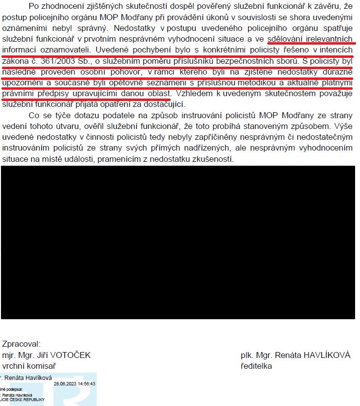 Pak už bylo jasné, že musí přijít informace o vyřízení stížnosti obsahující konstatování pochybení policistů. A to se taky stalo. Ředitelka obvodního ředitelství Polici Prahy IV nám k tomu sdělila následující: